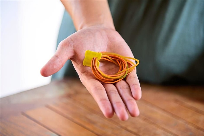 Имеете кучу банковских резинок лежащих беспорядочно в ящике стола? Закрепите их зажимом от хлебной упаковки! И порядок обеспечен.