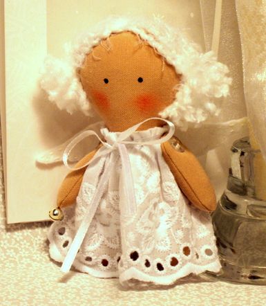Фантазируйте и сшейте несколько ангелов в различных нарядах и разными прическами. К ручке ангела приколите бубенчик или сердечко. Такая игрушка будет хорошим подарком или красивым украшением для Новогодней елочки.