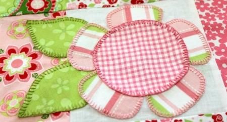 Затем следует проложить по возможности самый мелкий шов по краю рисунка. Шов должен пройти через ткань основы и ткань аппликации, не затронув при этом лекала. По завершению шва, уберите все булавки или наметку.