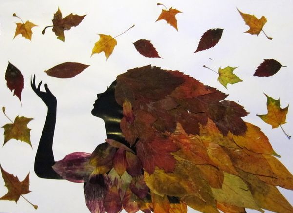 Тут нужна только ваша фантазия. Вы собираете листики разной формы и величины, комбинируя их в букеты, раскрашивая яркими красками. У вас получается, такая себе, своеобразная картина –мозаика.