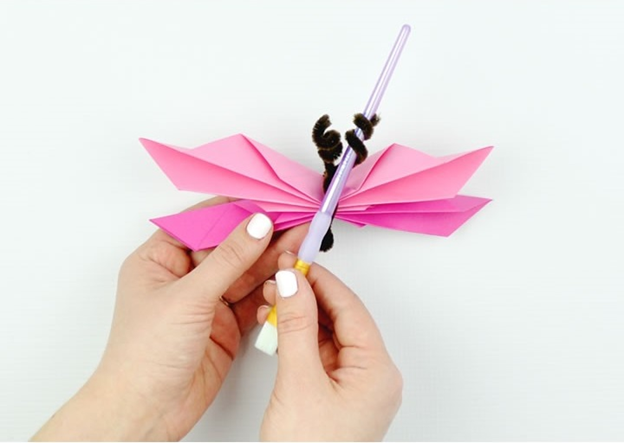 5. Свободные концы декоративной проволоки закрутите в виде спиральки, используя тонкий цилиндрический предмет, как ручка или карандаш, чтобы создать бабочке усики антенки.