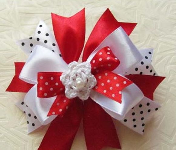 Чтобы сделать первый слой бантика, потребуются отрезки широких ленточек, длина которых составляет 12 см - 3 красных отрезка и 2 белых в горошек.