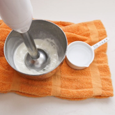 4. Теперь смесь нужно эмульгировать путем добавления одного до двух столовых ложек воды и при помощи ручного блендера. Взбивайте смесь по чуть-чуть добавляя воду, пока лосьон не станет консистенции густой сметаны.