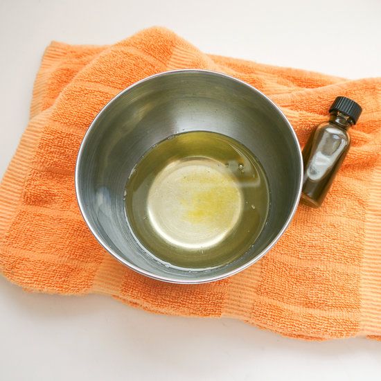 3. После того, как кокосовое масло и пчелиный воск растаял, аккуратно поместите на сложенное полотенце, чтобы не испортить поверхность и добавьте свое любимые эфирное масло. Дайте смеси остыть в течение 10 минут.