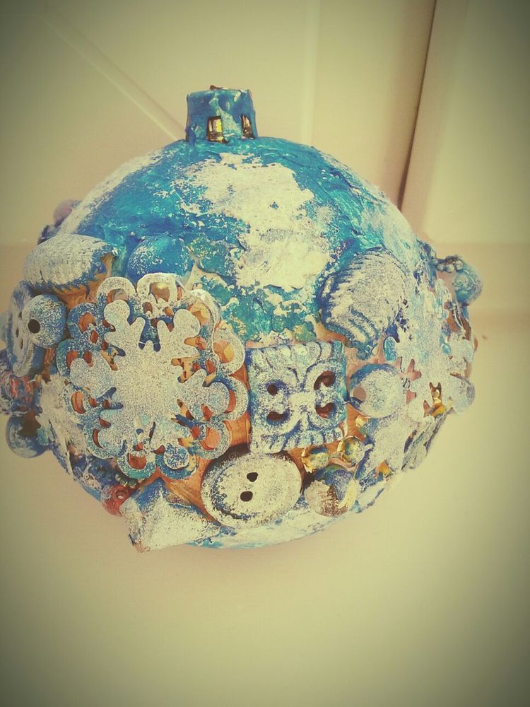 брался обычный елочный шарик ажур и все что в доме не нужно пуговицы макароны разбитый шарик елочный покрывалось сначала все акриловой краской наноситься губкой для мытья посуды краска она может быть синей , красной , темно синей , фиолетовый , розовый только не желтый потом покрывается после просушки феном белой краской похлопывающими движениями должен получится эффект заснеженности
