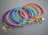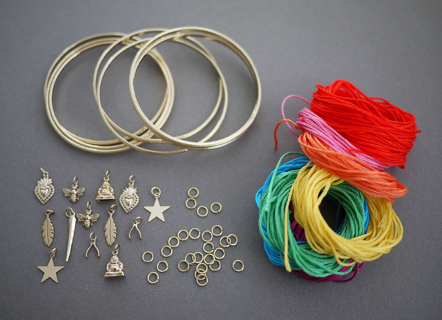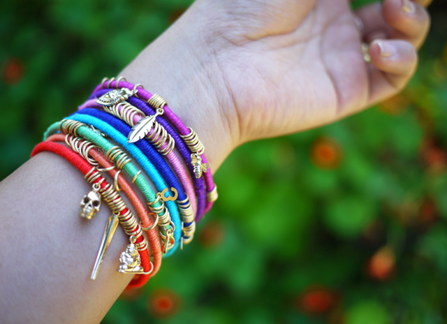 Браслетов много не бывает! Пересмотрите свою коллекцию украшений, возможно вам понравиться идея и у вас появиться желание, тонкие латунные браслеты преобразить и придать им новый, яркий обновленный вид. Возьмите яркие нитки для вышивки или шелковые нити, подвески для бижутерии, амулеты, соединительные кольца не бойтесь переборщить. Возможно кое-что уже есть в вашем арсенале?