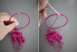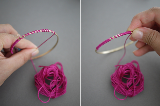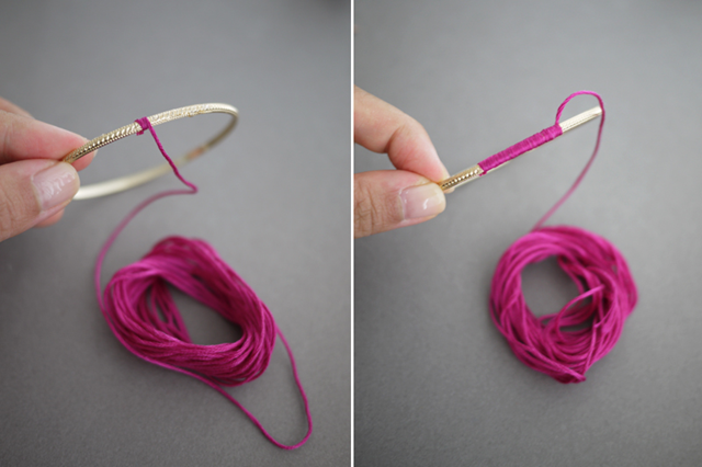Приложите конец нити в область, где нанесен клей и начните плотно оборачивать нить вокруг браслета.
