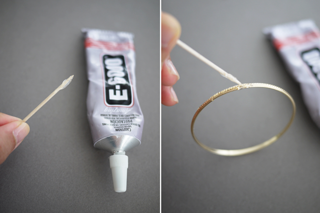 Нанесите небольшое количество клея на кончик зубочистки. Теперь нанесите каплю клея на браслет.