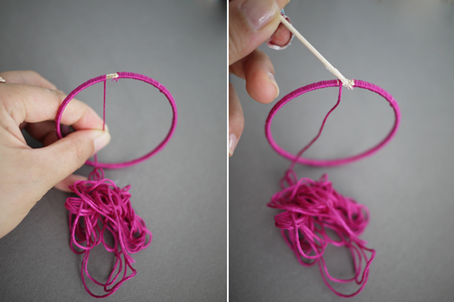 Наматывайте нить плотно не оставляя пробелов. Не волнуйтесь если образовались пробелы пальцами сдвигайте нити, чтобы их соединить.