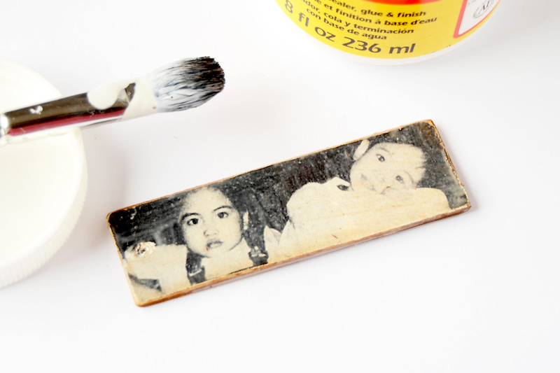 Шаг 5. Нанесите толстый слой клея, и положите фотографию лицевой стороной вниз на деревянную поверхность.
