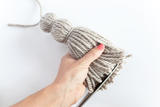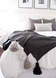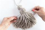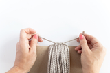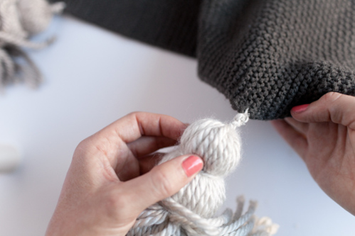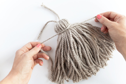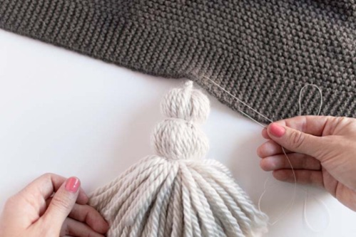 Ход работ: 1. Возьмите нить и начните обертывать ее вокруг картона, как показано на рисунке.2.Продолжайте обертывание, пока вы не достигнете требуемой толщины. Для этих кисточек нить обернута вокруг картона примерно 55 раз.3. Далее отрежьте нить. Возьмите небольшой отрезок пряжи, того же цвета чтобы закрепить нити, с одной стороны. Пропустите нить под намотанные на картон нити стяните, и на самом верху закрепите узлом, как представлено на фото.4. Далее разрежьте все нити нижней части кисточки. Для того, чтобы легче было разрезать сначала верхний узел завяжите свободно, а затем свяжите его туго, после того, как нити разрезаны. 5. Возьмите еще один отрезок нити (немного больше, чем длина вашей кисточки) и обвяжите в верхней части кисточки помпона, завяжите узел. После этого концы заведите во внутрь, длину оставьте, как у остальной части кисточки.6. Затем повторите и свяжите еще один раздел кисточки, создавая два шарика.7.Сделайте шесть кисточек для каждой из сторон пледа в разных тонах. 8. Возьмите иглу и нить. 9. Возьмите кисточку и сделайте еще один или два узла на вершине, концы нити обрежьте. Подровняйте концы кисточки, если это необходимо.10. Осталось пришить кисточки на расстоянии 30 см друг от друга, при этом чередуя цвета. Теперь можете укутаться и наслаждаться! Источник фотографий http://www.designsponge.com