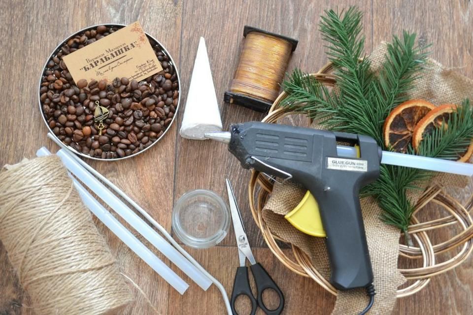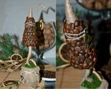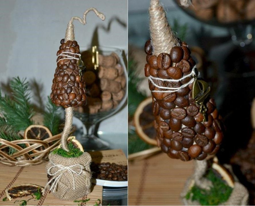 Зафиксируйте клеем лишний кусочек джгута. После того, как обмотаете и ножку елочки джгутом, можете приклеить зерна кофе к основанию, начиная с острого края, покрыв донышко и постепенно обклеивая все деревце.