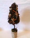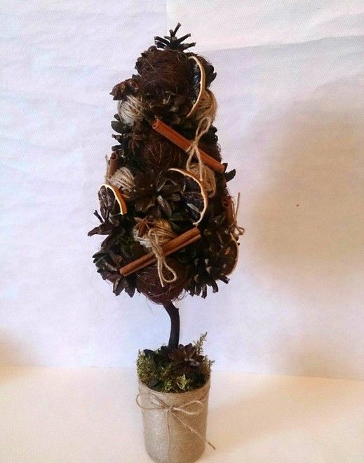 Чтобы сделать для него подставку, оберните баночку мешковиной, фиксируя клеем. Вставьте деревце внутрь и выложите мхом "лужайку. Теперь вам осталось лишь украсить вашу поделку, как вам пожелается: пуговками, ленточками, сухими кусочками цитрусовых, можете даже покрасить ее краской из баллончика!