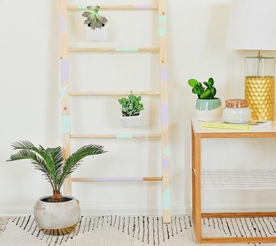 Традиционные места для домашних растений, вроде балконов или подоконников, поднадоели. Да и кашпо давно никого не удивишь. Предлагаем оригинальное интерьерное решение — лесенку, на которой можно развесить подвесные горшки с цветами. Получится такой мини-садик в пределах комнаты.