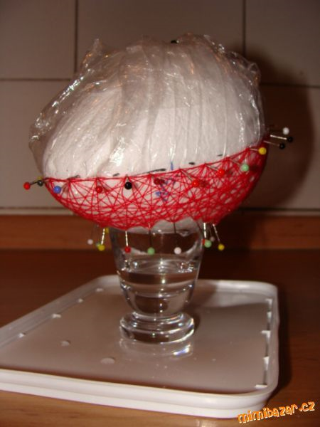 Закрепите пленку на пенопластовой форме по продольному диаметру булавками начиная с самой верхней и заканчивая в самой нижней точке. Убедитесь, что булавки равномерно распределены.
