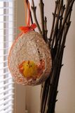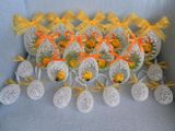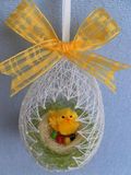 9. Используйте клей, чтобы соединить две половинки вместе, чтобы сформировать яйцо. Приклейте клеем ленту вокруг яйца или бант из ленты на верх. Поместите в середину яйца цыпленка из помпонов, цветы, декоративное сено. Пасхальное декоративное яйцо готово. Наслаждайтесь!