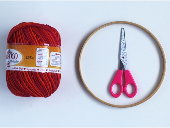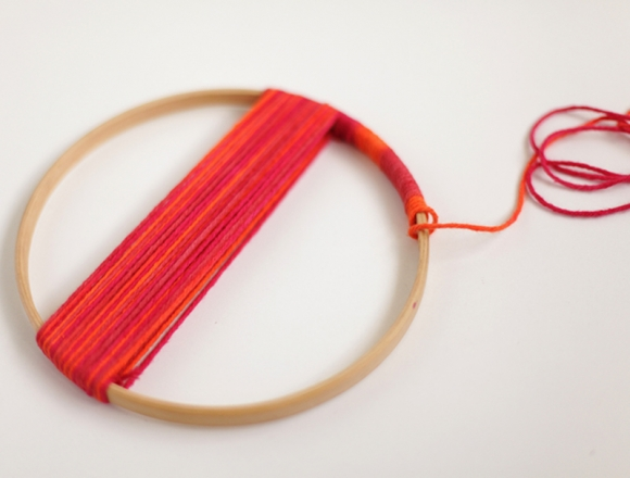 2.Привяжите нить маленьким узлом к ободу и обмотайте обод нитью в верхней и нижней части, это позволит лучше зафиксировать нить в дальнейшем.