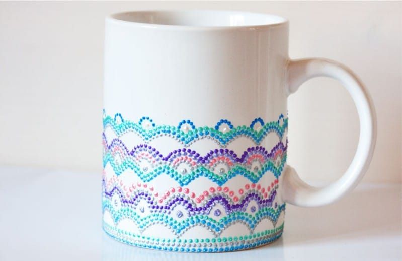 Лучше вначале нарисуйте самые большие точки, а потом переходите к деталям. Когда ваш узор будет готов, поставьте чашку в духовку на 30 мин при температуре 150-170 градусов. Это зафиксирует рисунок. Вуаля! Прекрасный и креативный подарок готов!