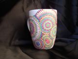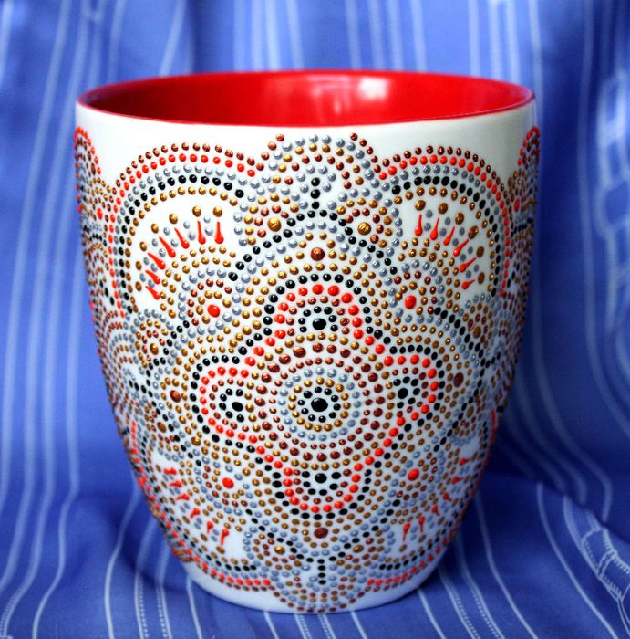 Перед тем, как начать расписывать кружку, советую потренироваться на бумаге и убедиться, что все краски в порядке. Начинайте рисовать, отступая от края чашки приблизительно на 2 см. Соблюдайте оптимальный диаметр точек и расстояние между ними.