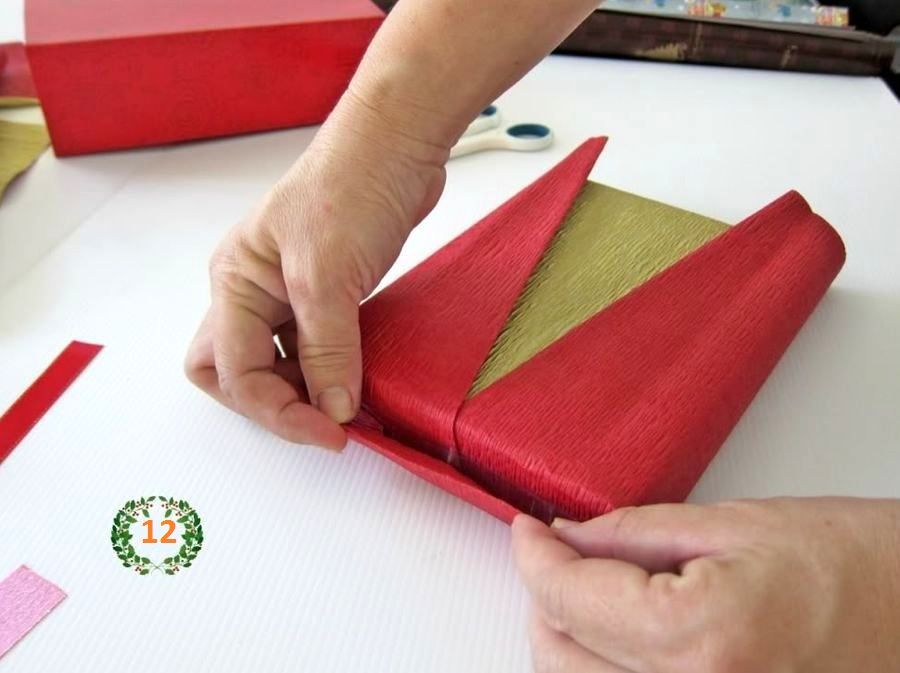 После этого можете завернуть коробочку в бумагу и закрепить стороны по бокам с помощью скотча.