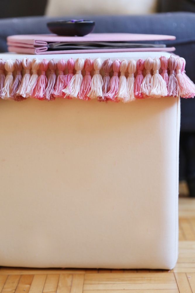 После того, как вы сделали все свои кисточки (поначалу вам будет трудновато и кисточки буду выглядеть неуклюже, но вы быстро приноровитесь), нанесите клей на круглую верхнюю петлю и прикрепите кисти к верхнему краю мебели, чтобы образовалась кистеобразная канва. Дайте клею полностью высохнуть (оставьте на ночь), и наслаждайтесь результатами своей работы.