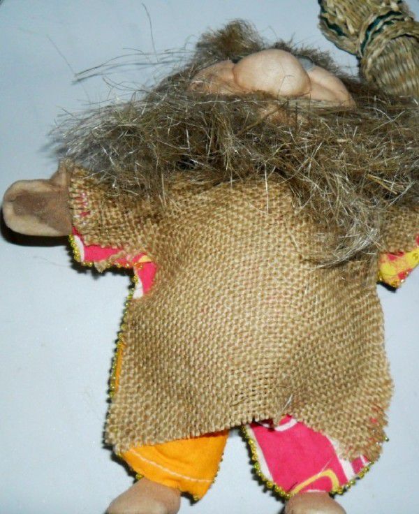 Бороду и нос нашему домовенку будем делать вот по такой схеме: берем распущенный нитки мешковины длиной 10 см и перевязываем их по центру, потом еще раз складываем пополам и еще раз перевязываем. Свободные концы ниток перегибаем назад и завязываем. В итоге у нас получились симпатичные нос и борода, которую нужно расправить и придать ей нормальный вид.