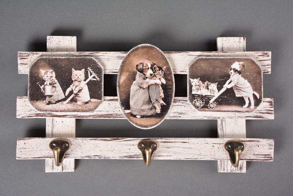 Финальный этап работы - собираем всю конструкцию ключницы: привинчиваем к вешалке-основе крючки и подклеиваем медальоны с декупажем.