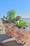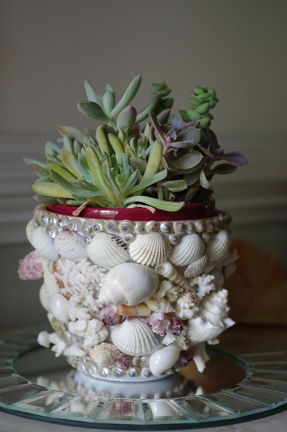 Если вы любите комнатные растения и у вас в доме есть много растений, добавьте немного креатива, разнообразьте горшки в которых растут ваши растения. Для любителей морской тематики, кто любит море и пляжный отдых, замечательная идея. Декор горшочка в морском стиле.