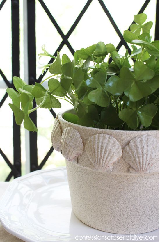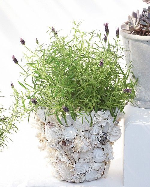 После того, как краска высохнет просто приступайте к оклеиванию стенок вокруг горшка. Используйте клеевой пистолет. Горячий клей отлично справиться с этой задачей. Совет: Начинайте обклеивать сначала большими ракушками, а затем заполняйте пустые пространства небольшими ракушками и камушками. Можете смело приклеивать ракушки внахлёст, чтобы заклеить все пробелы. Продолжайте добавлять ракушки пока стенки горшка не будут полностью заполнены. На самом деле нет никаких правил, просто поиграйте с ним, пока вы не будете довольны результатом. Теперь ваш простой глиняный горшок выглядит, как шедевр. Наслаждайтесь!