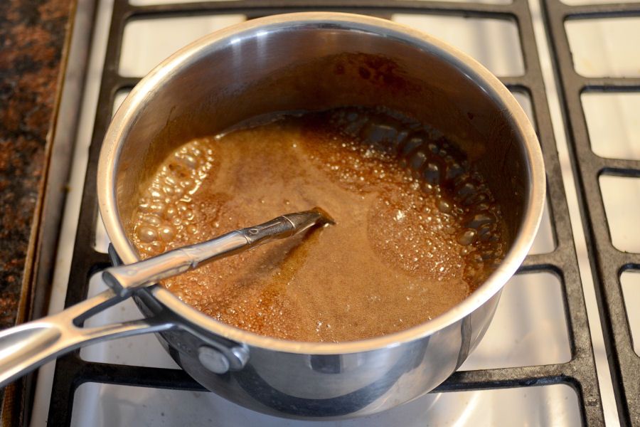 Растопите на сковороде 250 грамм сливочного масла, добавьте туда сахар и мёд.