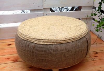 Возьмите бечевку и прокручивайте ее до краев окружности и далее, промазывая каждый новый виток клеем. Удалите оставшийся отрезок бечевки, свободный край закрепите с помощью скобы. Пуф покройте слоем лака и дайте изделию хорошенько подсохнуть.