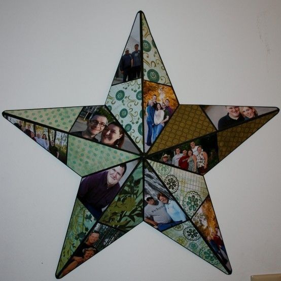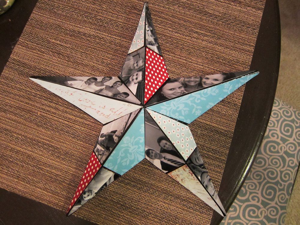 Вырежьте 10 бумажных форм из цветной бумаги в соответствии с гранями звезды. Сделайте то же с вашими фото. Аккуратно обрежьте края и углы, сохраняя максимум изображения. Главное, чтобы были видны лица и улыбки!))