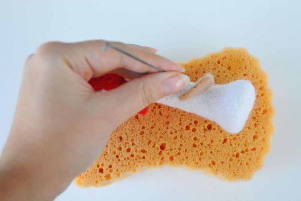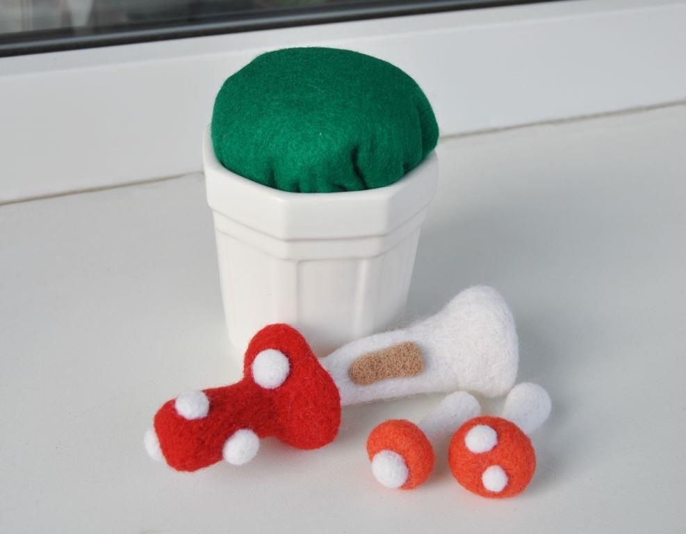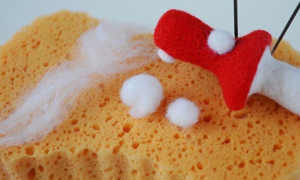 Пятнышки на шляпке изготавливаются из неплотных шариков из белой шерсти произвольного размера, которые просто приваливаются к основе средней иглой.