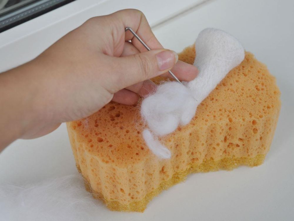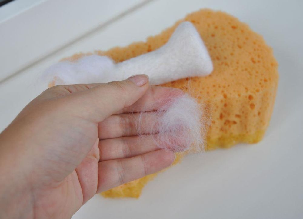 Как сделать поверхность фигурки красивой и гладкой? Для этого можно использовать накладки в виде тоненьких «облачков» из шерсти и тоненькую иглу для финишной отделки. Чуть приваляв прядки шерсти на подложке, аккуратно накладываем их на деталь и незаметно приваливаем, скрывая огрехи.