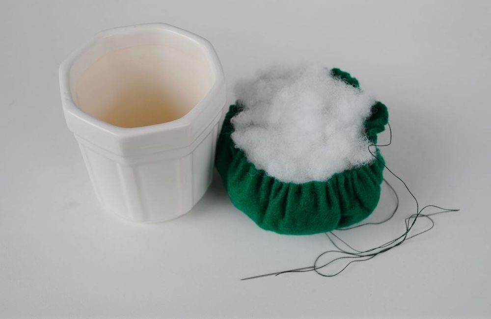 С помощью тарелки или циркуля обводим круг на ткани и прошиваем его по кругу сборочным стежком, постепенно утягивая нитку. Внутрь получившегося мешочка кладем набивку и зашиваем его не слишком плотно.