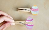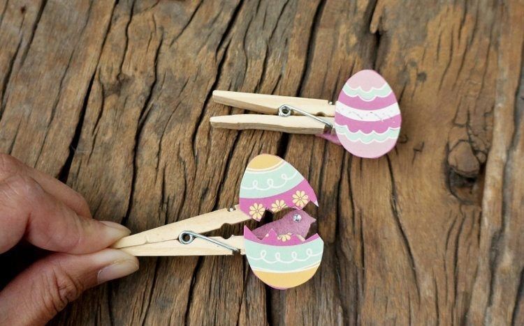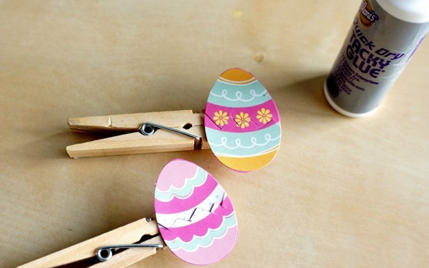 4. Чтобы игрушка была поинтереснее можете добавить цыпленка во внутрь яйца. Это могут быть либо наклейки птичек, либо нарисовать птичек на картоне и вырезать. Приклейте их с другой стороны прищепки так, чтобы это выглядело, что цыпленок сидит внутри яйца.