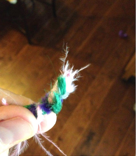 Подготовленные кусочки перышек, нитей, и т.д. скрутите вокруг друг друга, затем добавьте на скрученные концы каплю эпоксидной смолы, чтобы они образовали тонкий конец.