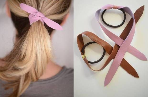 4. Изделие можно надевать на хвостик и завязывать двойным узлом используя концы кожаной полосы.