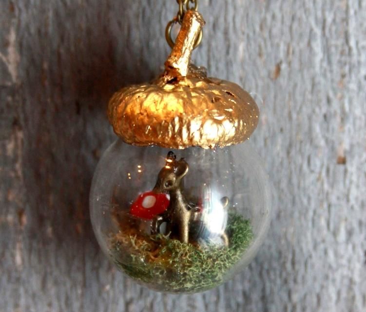 Подготовьте фигурки, которые вы хотите поместить внутрь подвески. Примерьте, проходят ли они сквозь горлышко стеклянного шарика. В нашем случае это фигурки олененка и мухомора.