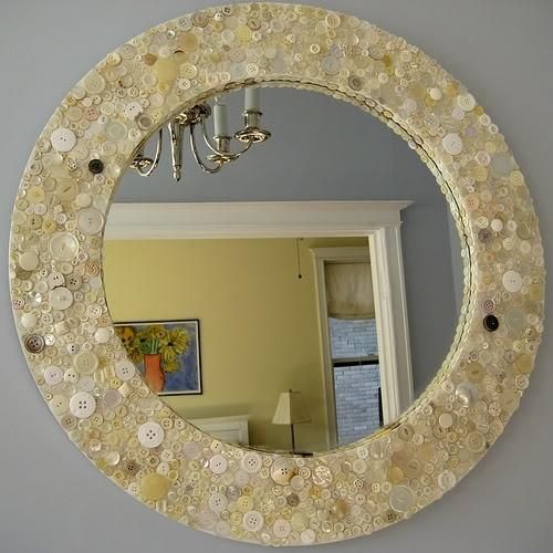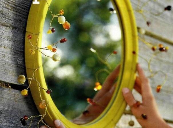 Любой материал с мелкими частицами может послужить основой для мозаики: плиточки, стеклышки, ракушки — что угодно. Кстати, приклеивать мозаичный материал можно прямо на зеркало, но рекомендуется предварительно разложить декор на изделии (без клея), чтобы была возможность хорошенько приладить друг к другу детали и сочетать их по цвету или размеру.Чтобы закрыть зияющее пространство, используйте обычную затирку для швов, что особенно полезно в случае, когда зеркало предназначено для влажного помещения. Вместо мозаики можно использовать крупные детали из керамической плитки, особенно если она имеет оригинальный рисунок — выглядеть такое зеркало будет очень нарядно.