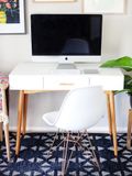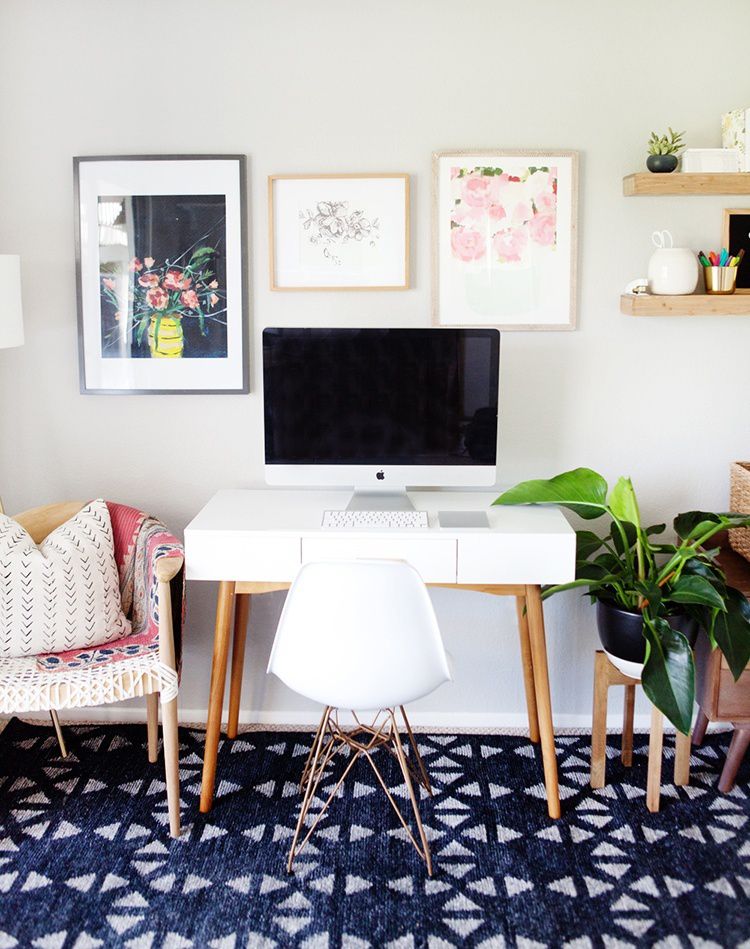 Мне нравится сочетание дерева и кожи, и это на самом деле очень удобно. Тёмный ковер добавляет "утяжеляет" пространство, оставаясь довольно нейтральным. Это оживляет наш небольшой милый офис. Полки прибавляют комнате веса и размера, а также это удобное место для различных рабочих и офисных принадлежностей. Цветочные принты дают только замечательный романтический акцент.