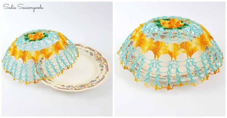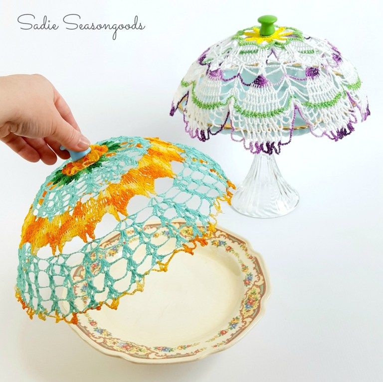 Если вы хотите иметь крышку, которая будет реально защищать продукты от пыли или насекомых во время вечеринок на свежем воздухе, вы можете полностью воспроизвести эту идею с тканью вместо вязанной салфетки.