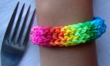 Также один из легких и популярных способов плетения. Выглядит он нарядно за счёт того, что у него ажурное структура, а ширина браслета достаточно велика. Вы можете выбрать количество столбиков из которых вязать браслет, чем их больше, тем шире будет браслет. Связать его можно при помощи обыкновенной вилки. Порядок работы: возьмите две обычные вилки и разверните их зубцами к себе, в середине скрепите их скотчем или резинками. Важно зафиксировать их таким образом, чтобы они не двигались во время плетения. Вилки нужны с четырьмя зубцами, и перед вами будет будет четыре пары зубчиков 1-2, 3-4, 5-6, 7-8.