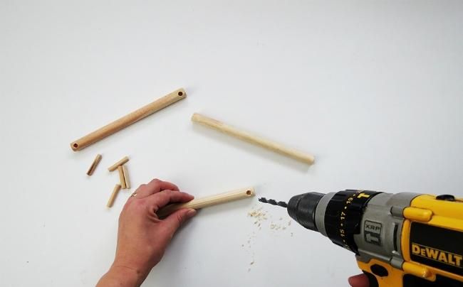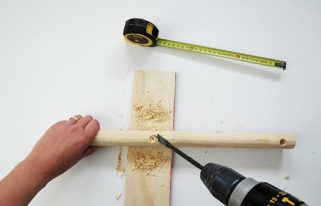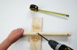 От одного из торцов толстой жерди отступите 2,5 см и нанесите отметку карандашом. Этот торец будет вершиной ствола. Затем поставьте еще две отметки на расстоянии 12 см друг от друга. С помощью дрели и 16-миллиметрового сверла в стволе просверлите сквозные отверстия.