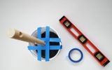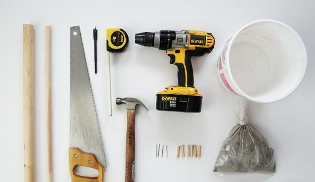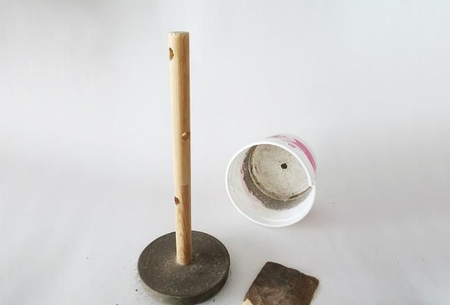 Вставьте центральную ось подставки гвоздями вниз, так чтобы они оказались внутри цементной смеси. Выровняйте жердь и зафиксируйте ее в вертикальном положении с помощью малярного скотча. Дайте смеси застыть в течение 48 часов.
