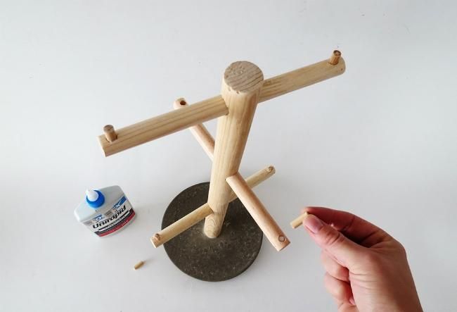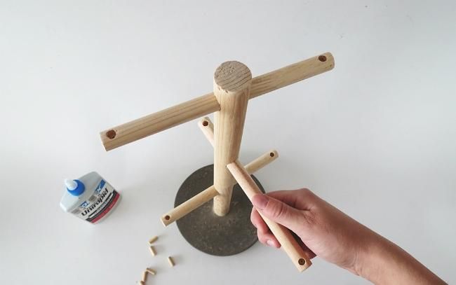 Вставьте ветки в отверстия, посадив их на столярный клей. Проследите, чтобы отверстия для ограничителей смотрели вверх.