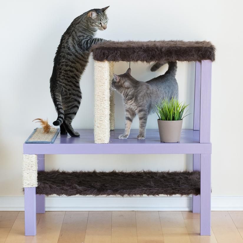 Добавьте игрушки. С помощью винта с кольцом мы подвесили мышонка. На столешницу нижнего стола можно приклеить полоску плотного ковролина, о который ваши питомцы также смогут поточить коготки.