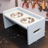 Лобзиком выпиливаем отверстия под ручки и миски, закругляем уголки на боковых частях подставки.