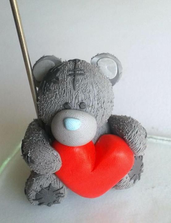Помещаем сердечко к нижним лапам медведя.Из светло-серого пластика добавляем мордочку в виде половинки шарика, прижимаем ее к сердечку.