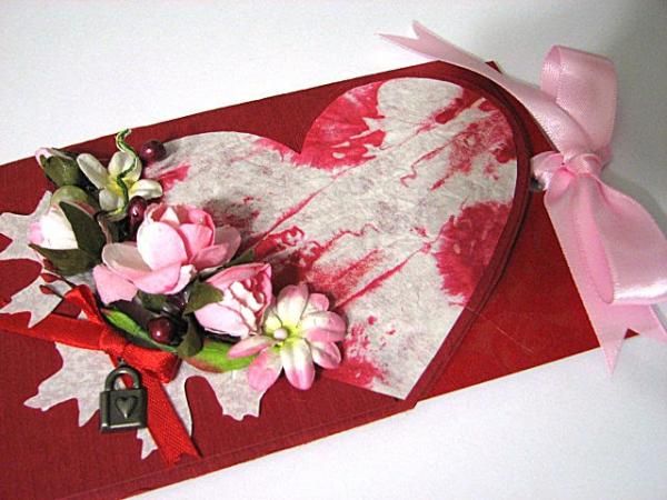 7). Атласную ленточку проденьте через дырочку в карте, заклейте конверт и вложите в него карточку.